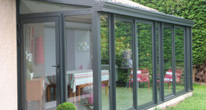 Véranda en aluminium, un pan, couleur gris , avec châssis coulissant